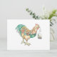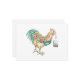 Invitation card (flat not folded) featuring a colorful hand-drawn illustration of a rooster ready to help you wake up in the morning with a hot cup of tea! Artwork: Pen and Ink on paper. Copyright Dominic A. White