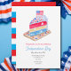 Este é um convite de festas que apresenta um bolo de aquarela no dia 4 de julho com as listras e estrelas vermelhas, brancas e azuis.