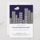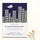 Convite de festas de aquecimento da casa de Watercolor com uma ilustração de uma cidade de prédios de apartamentos noturnos. Personalize o texto com o seu. Ilustrada e projetada por Patricia Alvarez.