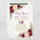 O Cartão de Convite para Chás de fraldas Dourados Florais de Watercolor Burgundy inclui rosas de madeira, rosas cor-de-rosa, rosas vermelhas e verde botânico. Foto de volta.
