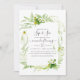 Vedar verde e ver o convite com samambaias, flores silvestres e morangos e um fundo verde de lavagem de cor aquosa.
