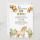 Um charmoso design com o tema ocidental, que apresenta um cavalo aquarela, cactos sorridentes em potes e balões de ouro. Perfeito para uma festa de aniversário de 1rua de rodeio de um pequeno vaqueiro com um toque rústico e brincalhão.