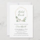 Este convite de brunch de tendências e chás de panela na moda apresenta uma coroa de folhas verdes, de cor d'água, eucalipto e uma falso estrutura geométrica de ouro sobre fundo branco.