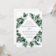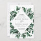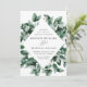 Convites florais elegantes com detalhes de seu casamento cercados por um quadro geométrico de folhas de cor d'água eucalipto. O reverso dos convites para o casamento do eucalipto apresenta um sólido fundo verde. Projetado para coordenar com nossa coleção de casamento Magnolia & Eucalyptus.
