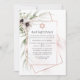 Convite Bat mitzvah com flores anêmonas e folhas de eucalipto em formato geométrico rosa dourado.