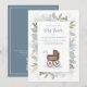 Esta design apresenta um verde-quente floral boho chic, uma folhagem simples de vintage para garotinhos, uma carruagem de bebês antiga, um quadrado clássico elegante tradicional, um rosa azul mínimo minimalista, um registro de presente de chá de fraldas, convites para bebês doces, um carrinho de carrinho de bebê buggting para bebê, um carrinho de bebê malhado, um azul-bebê malandrinho, azul-bebê malandro convites para bebê de idade com registro de presentes e código QR para a página de eventos do Facebook link URL do site, endereço Web online.