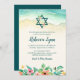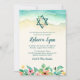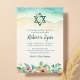 Esta elegante praia com o tema Bat Mitzvah convite é perfeito para o seu dia especial! A design apresenta flores tropicais de aquarela, Estrela de David e ondas oceânicas na areia.
