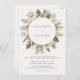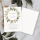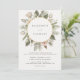 Este elegante convite para o casamento apresenta um círculo dourado rodeado por uma ilustração floral de cor d'água de rosas de marfim e verde sobre um fundo esbranquiçado. Personalize o texto da cinza de carvão com seus detalhes de casamento. O reverso é uma sombra coordenadora de esbranquiçado.