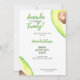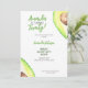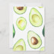 O design apresenta abacates verdes a aquarelas com tons macios e misturados, criando um toque fresco e artístico. Fontes simples e elegantes completam o visual lúdico, mas refinado.