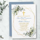Elegante Watercolor Greenery First Santa Communion Invitation inclui folhas de cor aquosa eucalipto e outras lindas folhagens botânicas verdes. Dourada Cruz. Pó Azul.