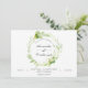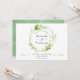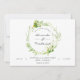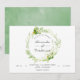 Convite de casamento verde e branco com samambaias, flores silvestres e morangos e um fundo de lavagem de cor verde-aquosa.