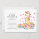 Adorável e alegre girafa mãozinha e mãozinha com bonito flores cor-de-rosa chá de fraldas convite para um chá de fraldas de meninas.