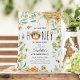 Elegante aquarela, bichinho de abelha, convite para aniversário de criança. O design apresenta uma borda de folhagem botânica verde-luxuosa, flores margarítmicas brancas e amarelas, pingando favos de mel e um boião de mel com abelhas melíferas fofinhas. O título "Our Sweet Little Honey" (Nosso Queridinho Doce) está se tornando (ADD AGE) seguindo os detalhes da celebração de aniversário em letra de serifa e caligrafia.