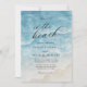 Elegant script calligraphy adds a romantic vibe to this timeless "on the beach" hand painted watercolor coastal wedding invitation, with an abstract ocean waves scene in the background.