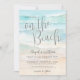 Simple Seaside Watercolor Summer On The Beach Wedding Invitation. A calming blue and tan watercolor background sets the scene, with the shoreline set at a slight angle for an elegant yet modern coastal vibe. The artwork keeps a soft, slightly abstract feel as the waves meet the sand.