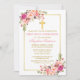 Elegant Watercolor Pink Blush Floral First Holy Communion Invitation includes pink roses and greenery. Gold Frame. Gold Cross.
