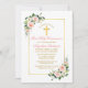 Modern Elegant Watercolor Pink Blush White Floral First Holy Communion Invitation includes pink roses, white flowers and botanical greenery. Features a gold frame and calligraphy script. Gold Cross.