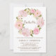 Convite batizante branco e elegante, com ilustrações de aquarela de rosas e peões cor-de-rosa e escamoteados. Isso será perfeito para festas de primavera e jardim.