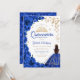 Convite para comemoração da Quinceanera com cor branca de ouro azul real. Possui uma morena em vestidos de vestido de bola, fonte de script, borboletas douradas, rosas e tiara. Perfeito para uma elegante celebração de glam estilo princesa. Personalize com seus próprios detalhes. Impressos convites Zazzle ou modelo de impressão digital instantânea para download.