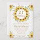 Girassol e flores brancas, cor d'água, flores brancas, design de moldura floral com confete dourado e fundo branco rústico