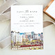 Esta salva apresenta uma pintura aquosa de San Diego, do horizonte da Califórnia e fontes modernas minimalistas para um destino divertido. Este design é perfeito para o seu casamento ou evento temático no sul da Califórnia.