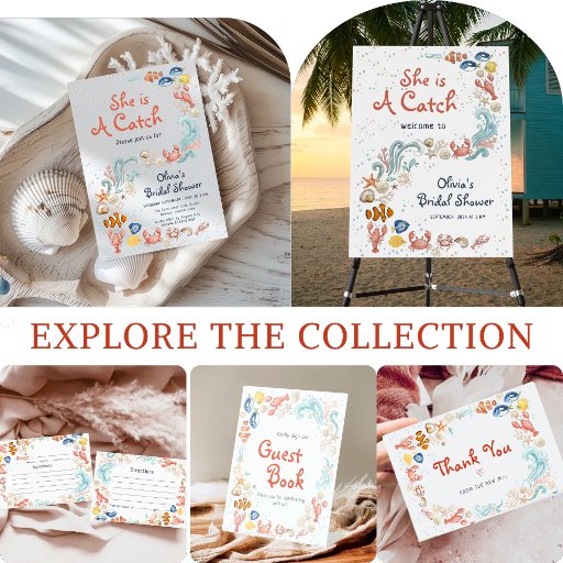 Make a splash with this playful "She Is A Catch" under the sea bridal shower invitation! Adorable watercolor illustrations feature tropical fish, clownfish, lobsters, crabs, starfish, seahorses, seashells, coral, and swirling ocean waves on a light bubbly background.