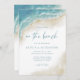 Perfect for destination weddings and any summer beach themed wedding, this coastal chic invitation features the popular phrase “on the beach” in handwriting calligraphy script, and a hand painted watercolor shoreline beach scene in the corners with ocean waves lapping on the sea shore.