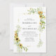 Elegante, convites florais de casamento com seus nomes e detalhes de casamento enquadrados por girassóis de aquarela e folhagem verde-esmagadora. Os convites de casamento de girassol se invertem para um fundo verde sólido. Projetado para coordenar com nossa coleção Watercolor Sunflower & Greenery.