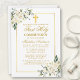 A Elegante Watercolor White Floral, Primeiro Convite à Santa Comunhão, inclui rosas brancas e verde. Dourado quadro. Dourada Cruz.