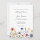 Beautiful wildflowers decorate the bottom of this colorful spring wedding invitation. Watercolor floral borders are perfect for a garden ceremony outdoors while flowers are in bloom. Elegant script dances above an orange, purple, yellow, and blue botanical meadow.
