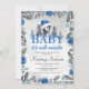 Convites de natal azul para chuveiros de bebês com um fundo de cinza lavado, flores e folhagem elegantes de Natal, um pinguim de bebê giro, um espalhamento de neve e um modelo de chá de fraldas personalizado que é fácil de personalizar.