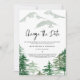 Mude a data! Anuncie à sua família e amigos o seu adiamento do casamento com este cartão de adiamento do casamento da floresta. Ele apresenta floresta aquosa e cenário de montanha com uma imagem de trás de cor aquosa verde correspondente. Personalize adicionando seus nomes e outros detalhes. Este cartão de cancelamento de casamento da floresta também será perfeito como anúncio de elopeamento.