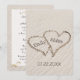 Corações de praia em design de areia flutuando com nomes de casal para convite de casamento. Os nomes são editáveis.