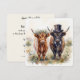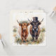 Two highland cattle dressed as a bride and groom stand in a field, with the bride donning a floral crown and veil and the groom sporting a top hat and bow tie.
