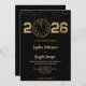 A wedding invitation with a black background and gold text is shown. The year "2026" and a clock design appear at the top, adding elegance.