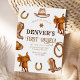 Os primeiros temas de aniversário do Rodeo são Aniversários de criança especiais, e este convite pode ajudá-lo a fazer uma festa de aniversário memorável. Caligrafia elegante sobre fundo lasso rodeado por acessórios de cowboy: chapéu, ferradura, sela, crachá do xerife e botas com roldanas.