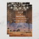 This rustic western barn wood wedding invitation featuring a western ranch mountains scene and string lights on a barn wood background can be personalized with your information in stylish typography. With all your special wedding day information on the reverse, including your registry QR code. Designed by Thisisnotme©