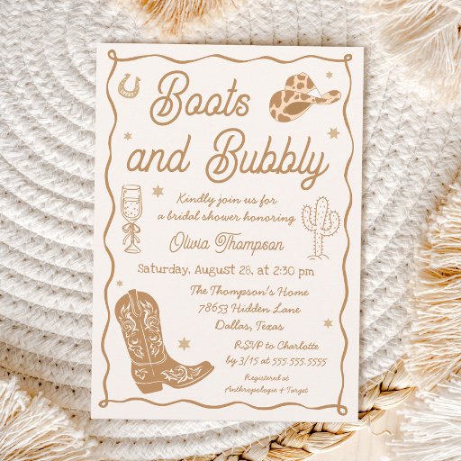 Celebrate the bride-to-be with this Personalized Western Boots and Bubbly Bridal Shower Invitation, perfect for boots and bubbly bridal shower ideas. Embrace western bridal shower ideas and country bridal shower ideas with this unique design, featuring charming boots and sparkling bubbly. Ideal for boho bridal shower ideas, country bridal shower ideas, and fun cowgirl bridal shower ideas, this invitation sets the tone for a stylish and unforgettable celebration.
