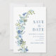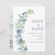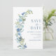 Incômoda na sofisticação com os nossos refinados convites para fotos "Salve a Data", com uma delicada coroa branca de flores vibrantes azuis. Elevem a antecipação para o seu casamento com este convite especial e único.