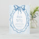 This whimsical invitation features a soft blue watercolor bow and a playful scalloped oval dotted frame against a classic blue and white striped background. Perfect for a wedding with a preppy or coastal aesthetic, this charming design provides a sweet, hand-painted look for your special celebration. Created by Simply Farmhouse Press.