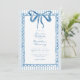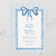 This whimsical invitation features a soft blue watercolor bow and a playful scalloped rectangle frame against a classic blue and white striped background. Perfect for a wedding with a preppy or coastal aesthetic, this charming design provides a sweet, hand-painted look for your special celebration. Created by Simply Farmhouse Press.