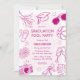 Unleash the spirit of summer fun with our whimsical doodle Graduation Pool Party invitation! Framed with pink doodle illustrations on a dusty pink background, this invitation captures the essence of sunshine and laughter. The modern grad party template, adorned with flip flops, scroll, camera, beach ball, motarboard, sunglasses, tropical palm leaves, inflatables and drinks, promises a celebration to remember. Perfect for grads who want to celebrate their success in the sun!