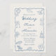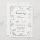 This whimsical coastal dusty blue and ivory wedding invitation is elegant with a relaxed seaside aesthetic, featuring a wavy scallop frame, hand drawn beach doodles, and casual handwriting script.