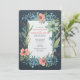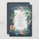 Um belo convite para o casamento que tem a design de um quadro floral com folhas contra fundo escuro, no estilo do aquamarino escuro, ilustrações texturizadas, aquarela e cores vibrantes de azul legal, salmão e verde. É tão caprichoso, delicado e fofo. Escolha perfeita para um casamento na primavera.