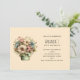 A birthday invitation with a cute image. Blue. pink and cream colored flowers with green leaves. Set inside a green flower pot with a green plaid cloth hanging over the side.