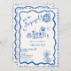 Este estilo trendy desenhado para o convite ilustrado de compromisso apresenta uma bola de disco e elementos da mesa de jantar. O design caprichoso e peculiar inclui fontes escritas à mão e rabiscos de celebração. Estilo azul mediterrânico de cobalto para o clássico, mas moderno, estacionário de casamento.