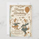 Este cartão de aniversário, inspirado na vintage, contém duas raposas antropomórficas encantadoras celebrando alegremente num ambiente de floresta balnear. Criada em uma sépia e paleta azul-céu em papel envelhecido texturizado, a design apresenta intrincadas bordas decorativas, floresces florais e elementos de fantasia como sóis sorridentes, nuvens flutuantes e delicadas obras de rolagem. A cena lúdica inclui um bolo em camadas, um balão e expressões alegres, todas sob a saudação ousada e maravilhosamente escrita com "Parabéns". A ilustração combina a estética nostálgica de conto de fadas com um humor suave e animador, perfeito para evocar a magia infantil e a celebração de eternos.