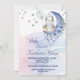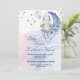 Excelente para um convite para o tema de menina ou chá de fraldas surpresa. Todos os detalhes (nome, detalhes do rsvp, localização e data/hora) podem ser personalizados de acordo com suas necessidades. O design apresenta um pinguim bonito sentado em uma lua mágica com flores azuis e uma bela parte de fundo de névoa rosa e azul da coleção de temas animais Selva de Whimsical.