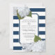 Flores brancas de hydrangea sobre um fundo largo e azul-marinho com uma faixa branca, com um deco de arte, inspiraram um quadro de canto chanfrado. A trabalho de arte que foi pintada manualmente em pastéis de petróleo por Audrey Jeanne Roberts é colocada em camadas acima de tudo. Um estilo impressionista e macio, um aglomerado floral de hydrangea azul flexível e solto, tem uma sensação antiga - mas é uma nova arte. Romântica. Simples. Tendência. Está disponível um conjunto completo de convites para casamento. Audrey Jeanne Roberts, todos os direitos reservados.