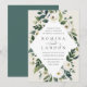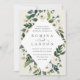 Nosso convite para o casamento de White Peony rodeia seus detalhes do dia do casamento com uma estrutura geométrica moderna de verde-coloração d'água pintada, folhagem botânica, rosa branca e flores de peônia.